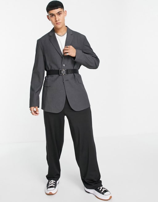 ASOS DESIGN – Mörkgrå kostym med svart vävt skärp