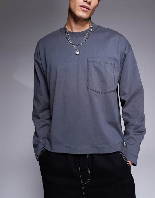 ASOS DESIGN – Mörkgrå, kraftig t-shirt i oversize med boxig passform, långa ärmar och framficka