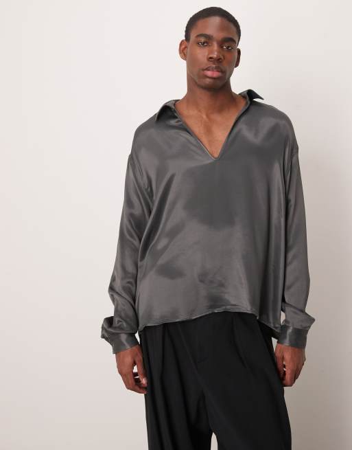 ASOS DESIGN – Mörkgrå, långärmad satinskjorta med djup v-ringning