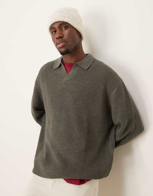ASOS DESIGN – Mörkgrå, melerad, ribbstickad fiskartröja i oversize med sprund vid halsen