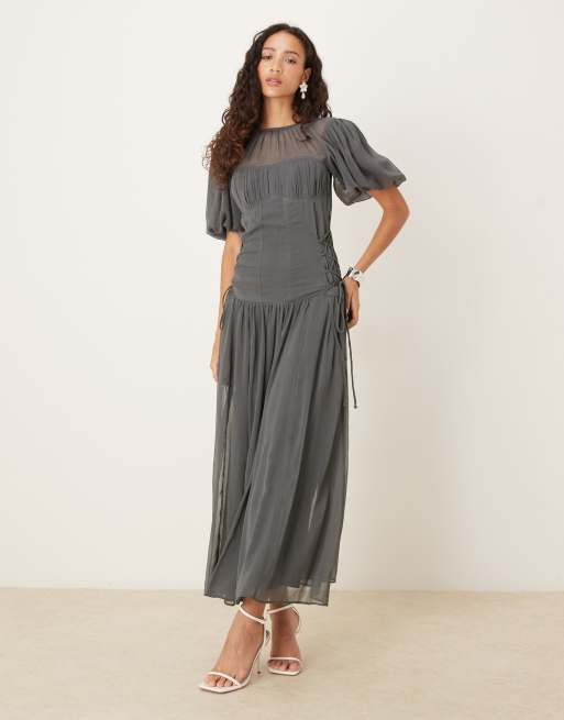 ASOS DESIGN – Mörkgrå midaxiklänning med puffärmar i chiffong