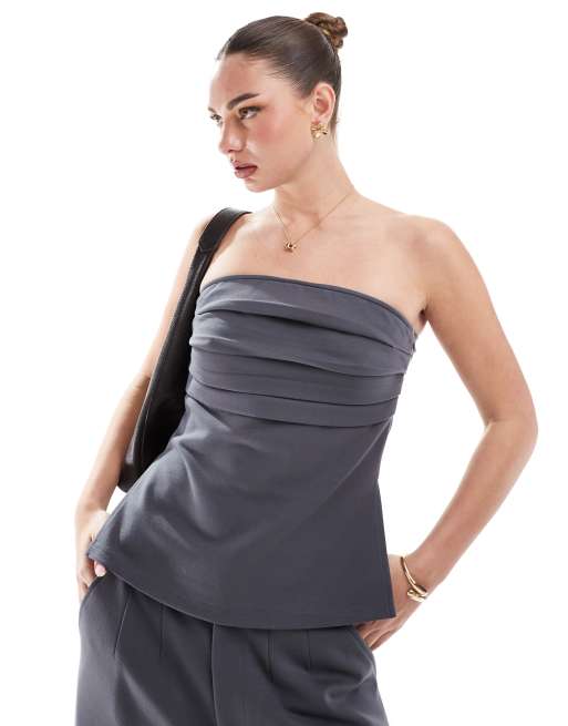 ASOS DESIGN – Mörkgrå, plisserad bandeau-topp i ponte, del av set