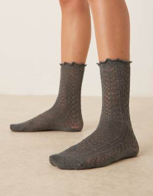 ASOS DESIGN – Mörkgrå, pointellestickade ankelstrumpor med volangkanter