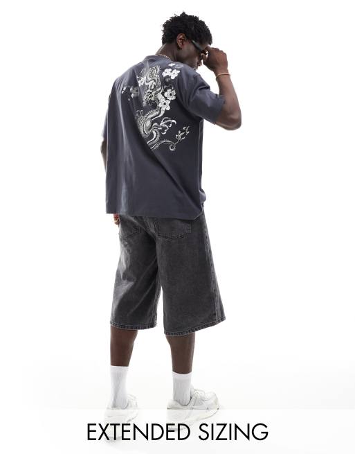 ASOS DESIGN – Mörkgrå t-shirt i oversize med blommigt draktryck baktill