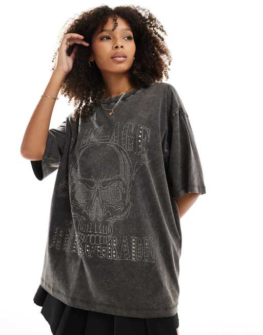 ASOS DESIGN – Mörkgrå tvättad t-shirt i oversize med värmefixerat rockig "dödskalle"-strasstryck