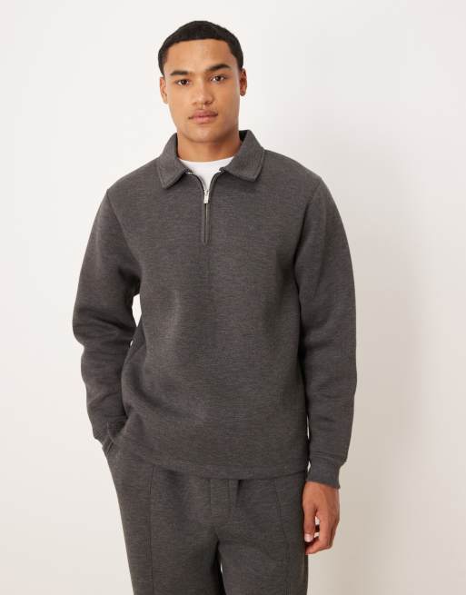 ASOS DESIGN – Mörkgråmelerad, kraftig sweatshirt i standard fit och scubaliknande tyg med kvartslång dragkedja, del av set
