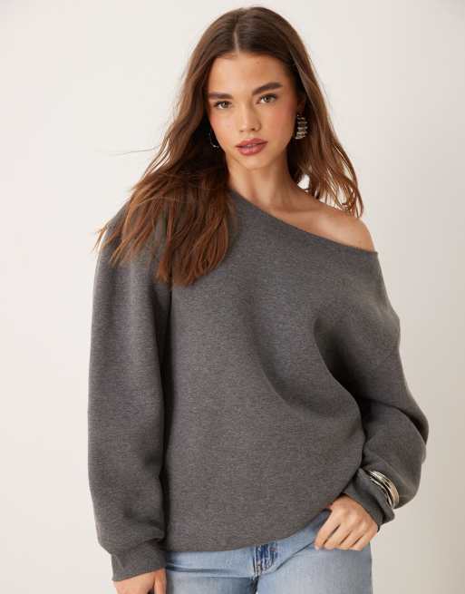 ASOS DESIGN – Mörkgråmelerad sweatshirt i oversize med off shoulder