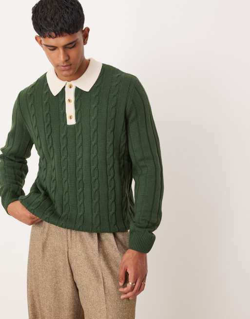 ASOS DESIGN – Mörkgrön, avslappnad, kabelstickad pikétröja