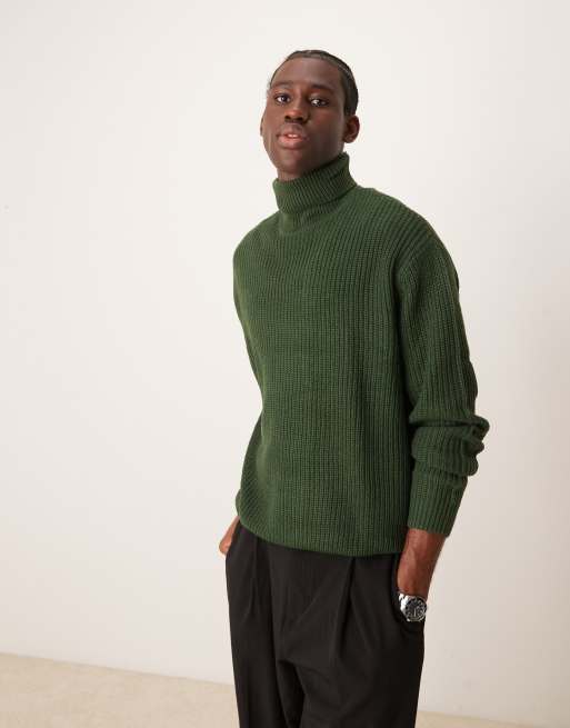 ASOS DESIGN – Mörkgrön, ribbstickad fiskartröja i oversize med polokrage