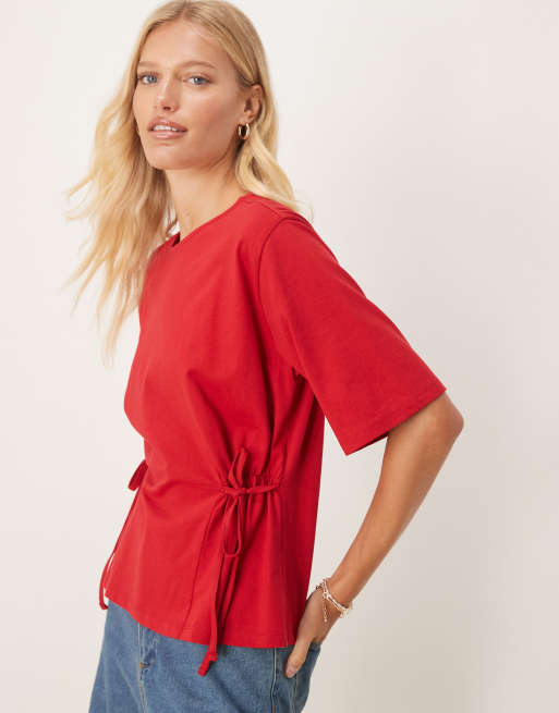 ASOS DESIGN – Mörkröd t-shirt med indragen detalj i sidan