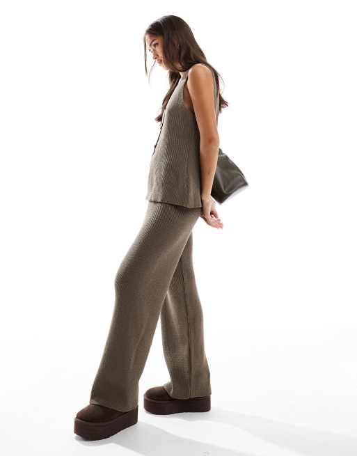 ASOS DESIGN – Mörkt brungrå, stickade byxor med vida ben, del av set