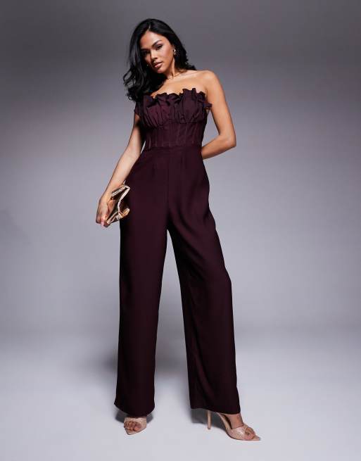 ASOS DESIGN – Mörkt chokladbrun jumpsuit med volang på bysten och kontrasterande korsett