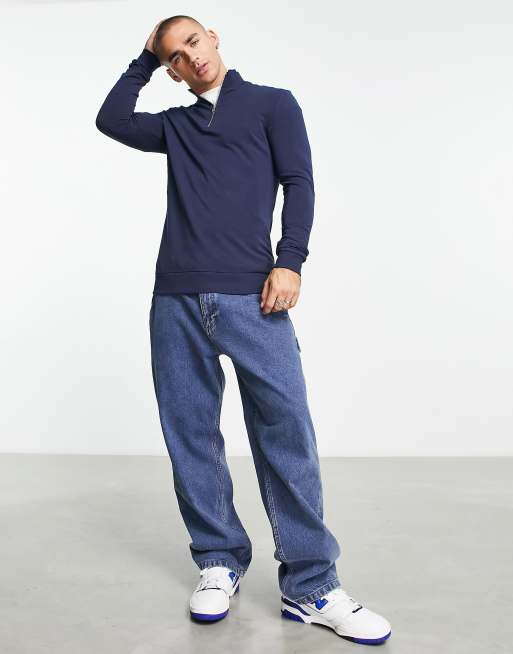 ASOS DESIGN – Mörkt marinblå sweatshirt i muscle fit med kort dragkedja