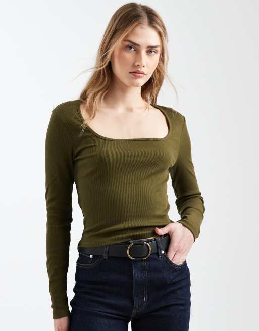ASOS DESIGN – Mörkt olivgrön, ribbad topp med fyrkantig halsringning och långa ärmar