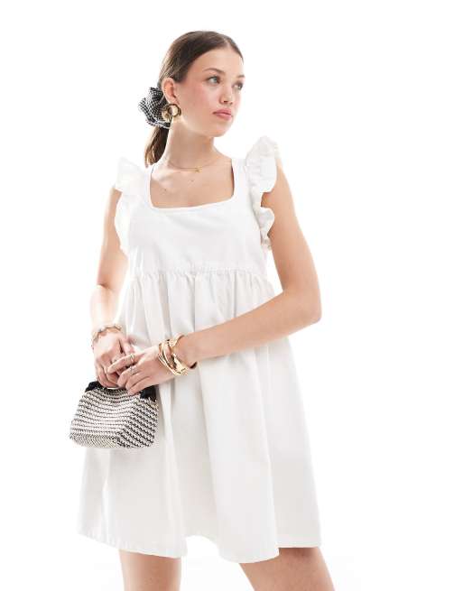 ASOS DESIGN – Naturvit, mjuk jeansklänning i minilängd med rynkad söm och rosett baktill