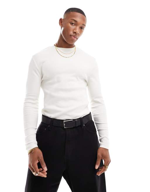 ASOS DESIGN – Naturvit ribbad t-shirt med långa ärmar och muscle fit