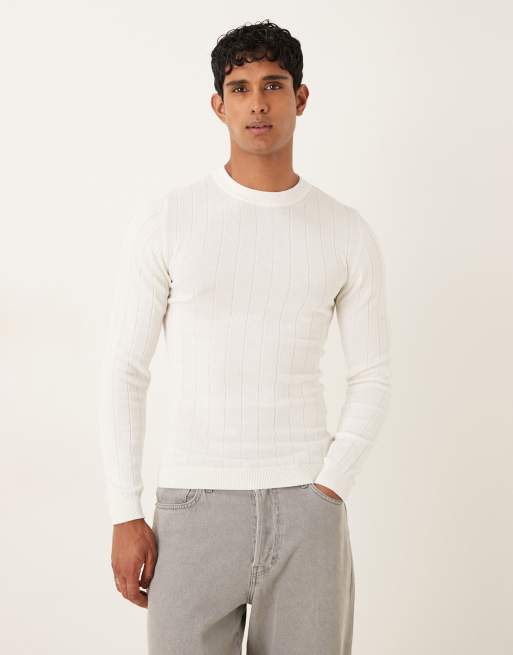 ASOS DESIGN – Naturvit, ribbstickad t-shirt i muscle fit med långa ärmar