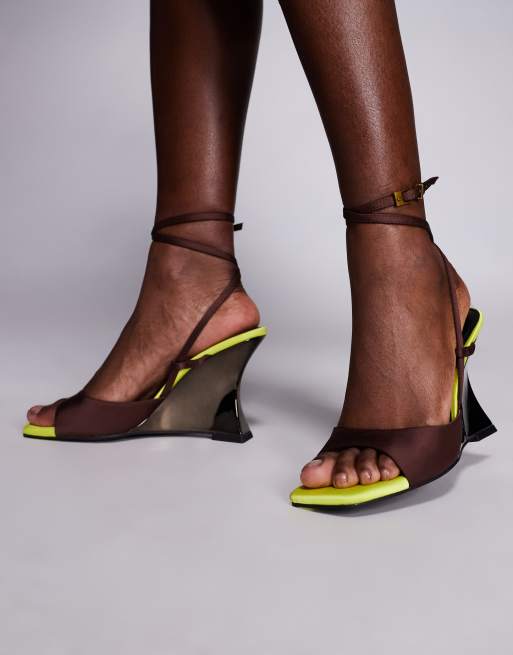 ASOS DESIGN – Nightshade – Bruna och neongula sandaler med skulpterande, elektropläterade kilklackar