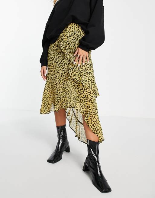 ASoS DESIGN – Ockrablommig midikjol med volang