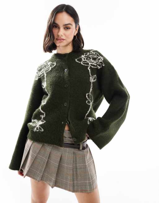 ASOS DESIGN – Olivfärgad, stickad kofta med kontrastfärgade blommor