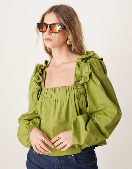 ASOS DESIGN – Olivgrön blus i poplin med trapetsdesign och volang