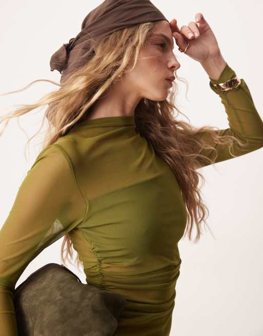 ASOS DESIGN – Olivgrön, långärmad topp med rynkad sida och hög krage