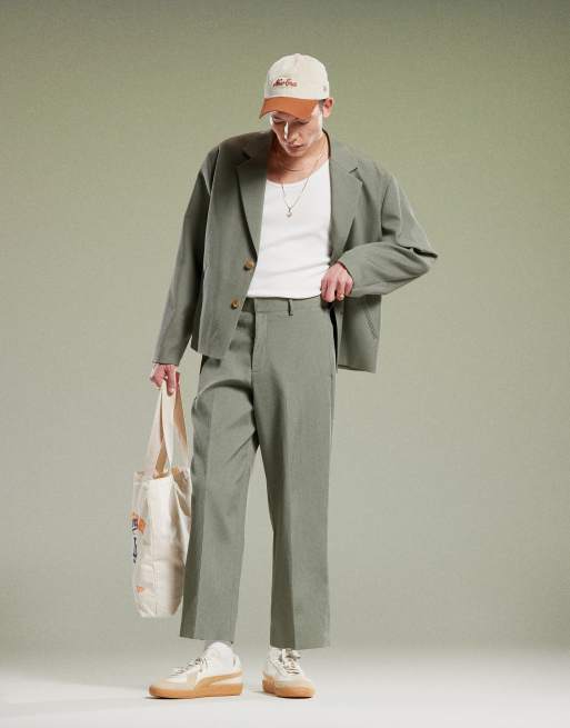 ASOS DESIGN – Olivgröna, ribbade kostymbyxor med vida ben
