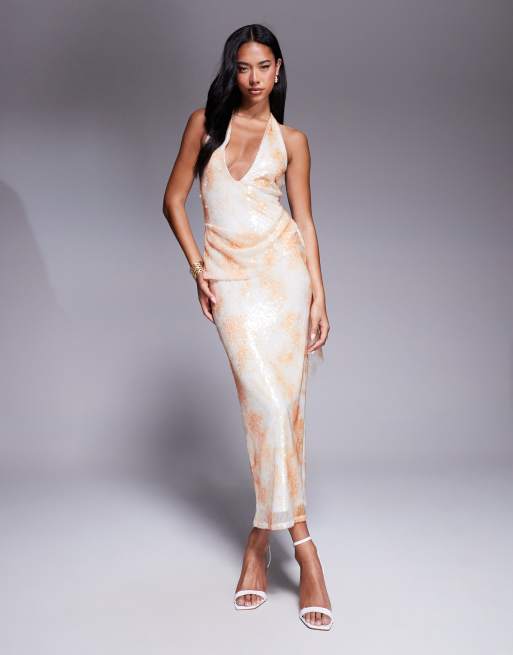 ASOS DESIGN – Orange, mönstrad maxiklänning med halterneck och paljetter