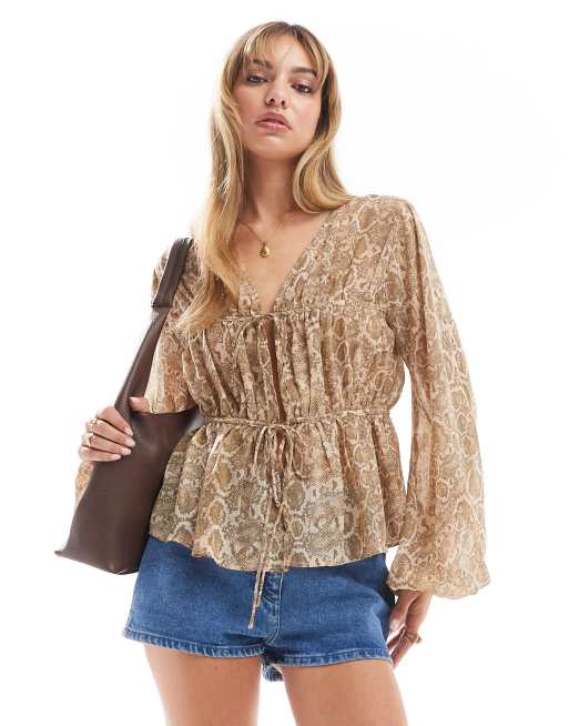 ASOS DESIGN – Ormskinnsmönstrad, långärmad topp med knytband