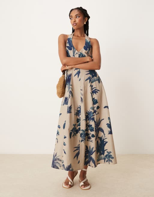 ASOS DESIGN – Palmmönstrad midiklänning med halterneck och klockad kjol