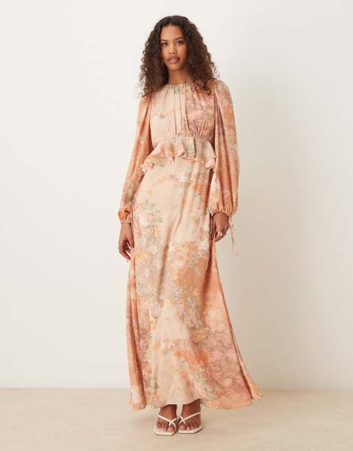 ASOS DESIGN – Persikofärgad, blommig maxiklänning med långa ärmar och rynkad midja