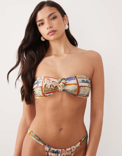 ASOS DESIGN – Posey – Vykortsmönstrad bikiniöverdel i bandeau-modell med knut