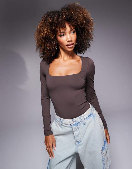 ASOS DESIGN – Premium – Chokladbrun, skulpterande body med fyrkantig halsringning och långa ärmar