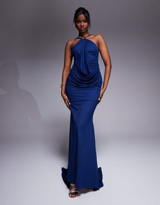 ASOS DESIGN – Premium – Mörkblå maxiklänning i linne och jersey med halterneck, flerfärgad kantdetalj och släp