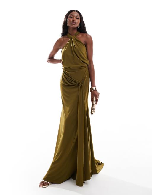 ASOS DESIGN – Premium – Mörkgrön maxiklänning med halterneck och banddetalj