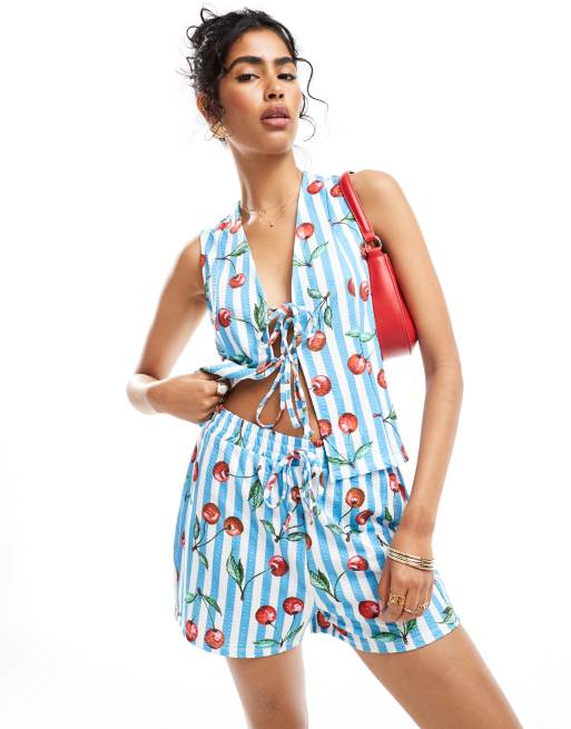 ASOS DESIGN – Randiga och körsbärsmönstrade shorts med knytning i midjan, del av set