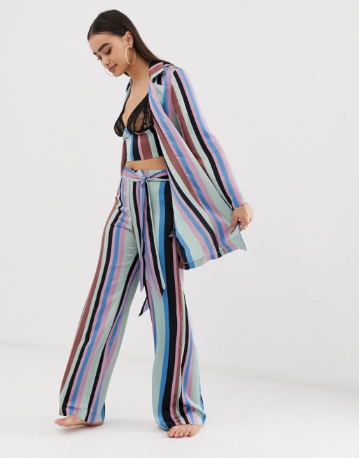 ASOS DESIGN – Randigt linne med spetskupor, vida byxor och jacka i satin