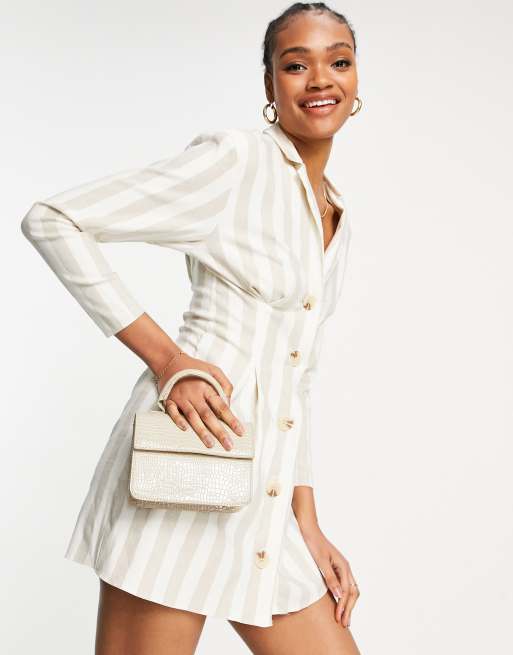 ASOS DESIGN – Randigt smokingklänning av linne i minilängd med naturfärgning