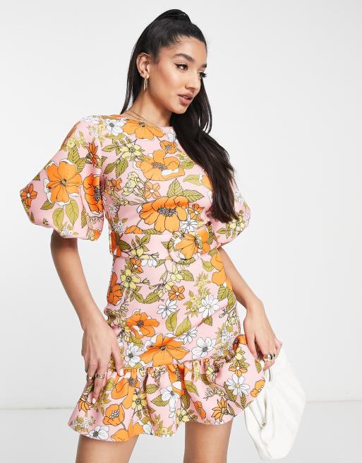 ASOS DESIGN – Retroblommig, panelsydd miniklänning med peplumfåll och skärp