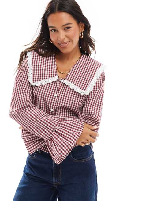 ASOS DESIGN – Röd, ginghamrutig blus med oversize-krage