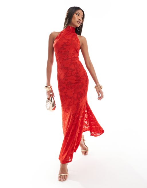 ASOS DESIGN – Röd maxiklänning i skir devoré med halterneck och låg rygg