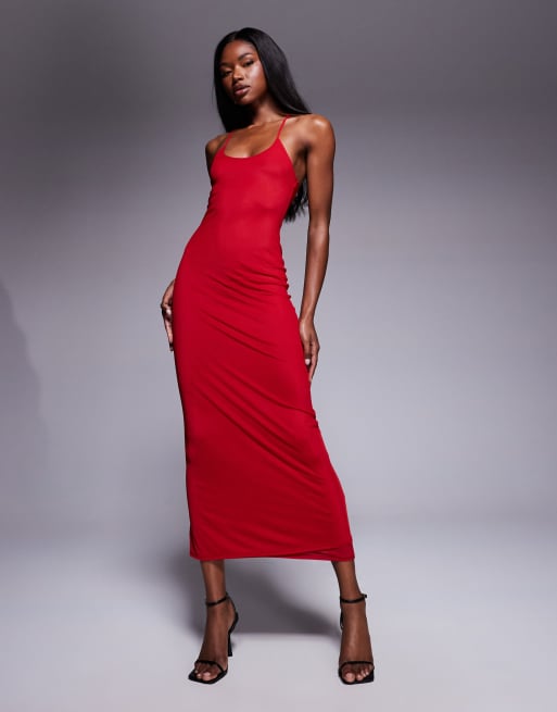 ASOS DESIGN – Röd midiklänning i mesh med djup ringning och smala axelband