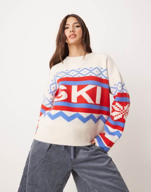 ASOS DESIGN – Röd och blå tröja med ränder och "ski"-text