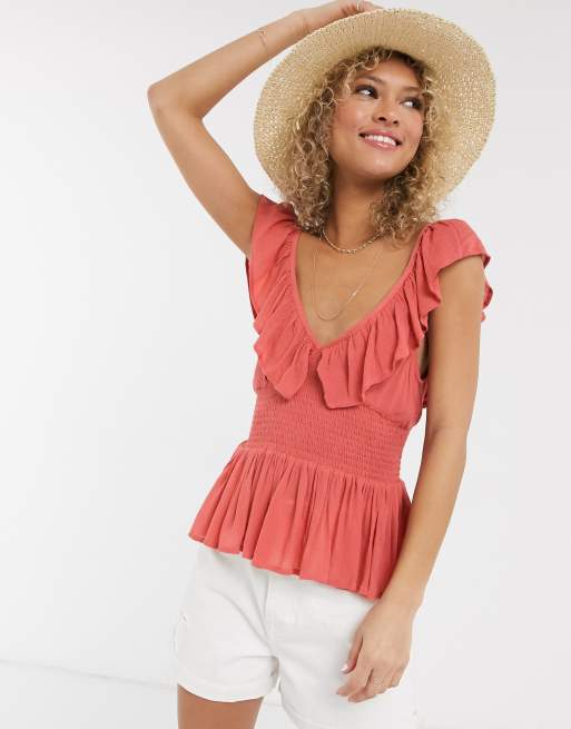 ASOS DESIGN – Röd topp med smockad midja och volang