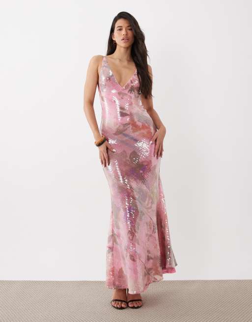 ASOS DESIGN – Rosa, blommig maxiklänning med djup halsringning, fishtail och glansiga paljetter