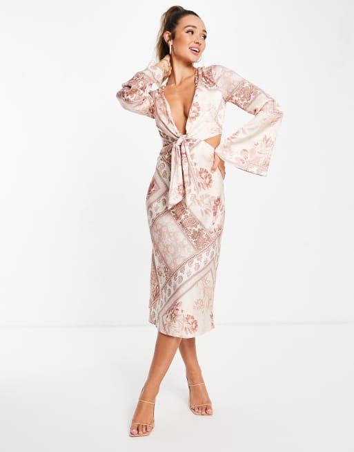 ASOS DESIGN – Rosa blommig midiklänning av satin i lappad stil med utsvängda ärmar, utskurna detaljer och knytning framtill