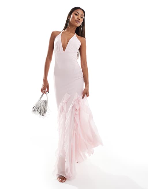 ASOS DESIGN – Rosa maxiklänning i mesh med panelsydd detalj, djup urringning, volang och slits framtill
