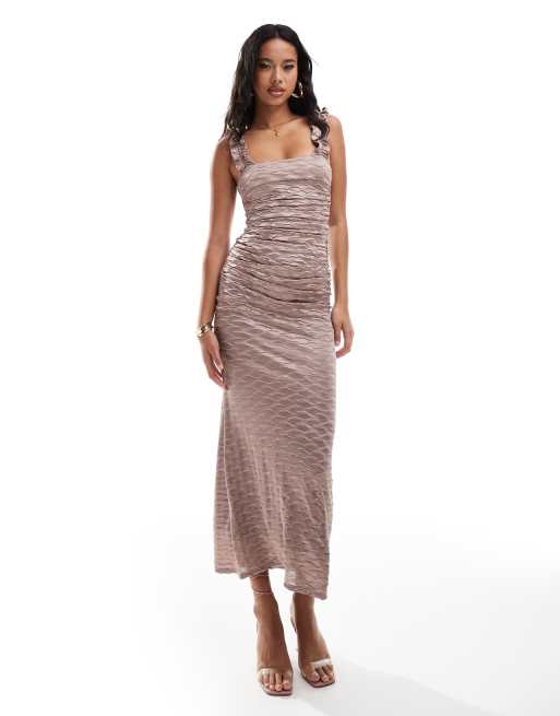 ASOS DESIGN – Rosa, metallisk midiklänning med fyrkantig halsringning, veck och rynkade axelband