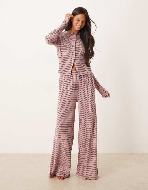 ASOS DESIGN – Rosa och bruna, randiga, ribbade pyjamasbyxor med vida ben