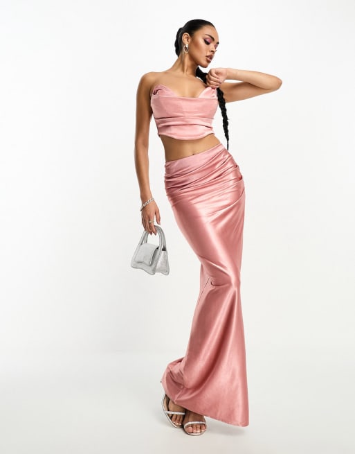 ASOS DESIGN – Rosa set i satin med axelbandslös korsett-topp och maxikjol